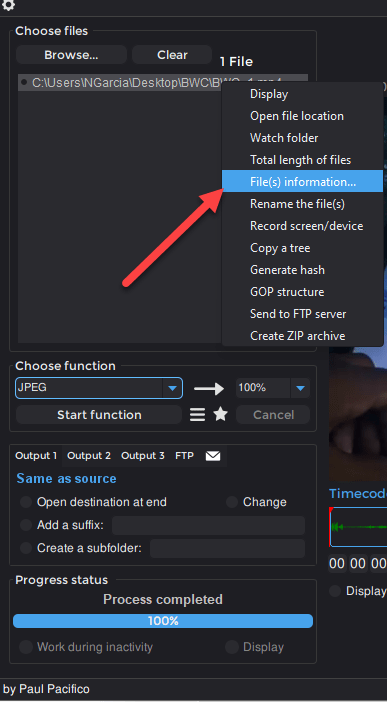 Just like VLC, you can configure Shutter Encoder to take snapshots at specific intervals in a video. Start by importing the video into Shutter Encoder. Find the frame rate of the video by right-clicking on the imported video selecting “File(s) Information”. This will open a window displaying information about the file. Under the General section you will see the “Frame rate” setting.